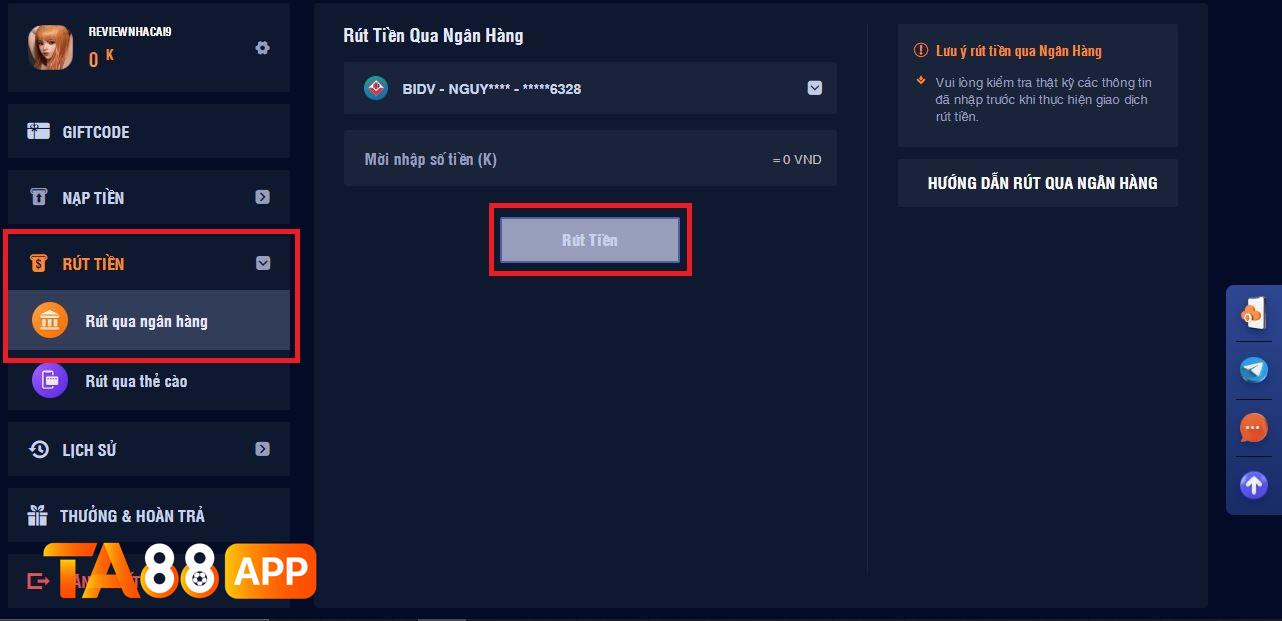 Lưu ý khi rút tiền tại Ta88 về BIDV