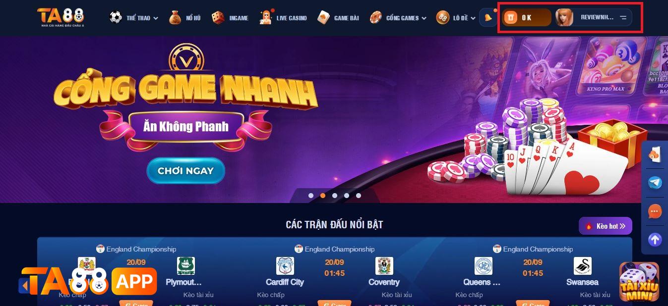 Bước 1: Tại trang chủ Ta88, nhấn vào biểu tượng tài khoản Ta88 của bạn.