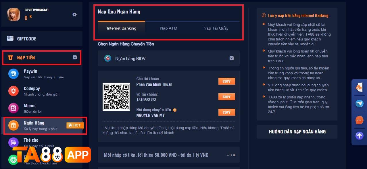 Ta88 cung cấp cho người chơi hình thức Nạp tiền cơ bản nhất thông qua chuyển khoản thủ công.