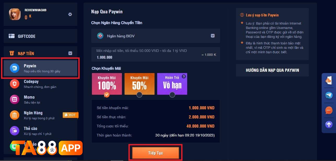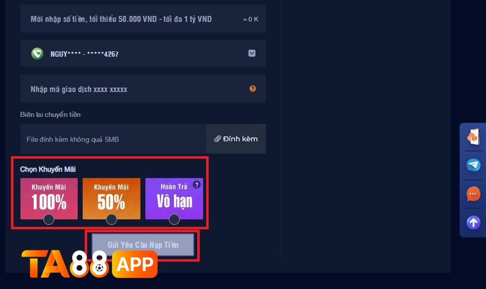 Đừng quên chọn tham gia chương trình khuyến mãi của Ta88 nhé. Hiện tại áp dụng cho nạp ngân hàng BIDV có 3 khuyến mãi: Khuyến mãi 100% tiền nạp, Khuyến mãi 50% tiền nạp, Hoàn trả cược.