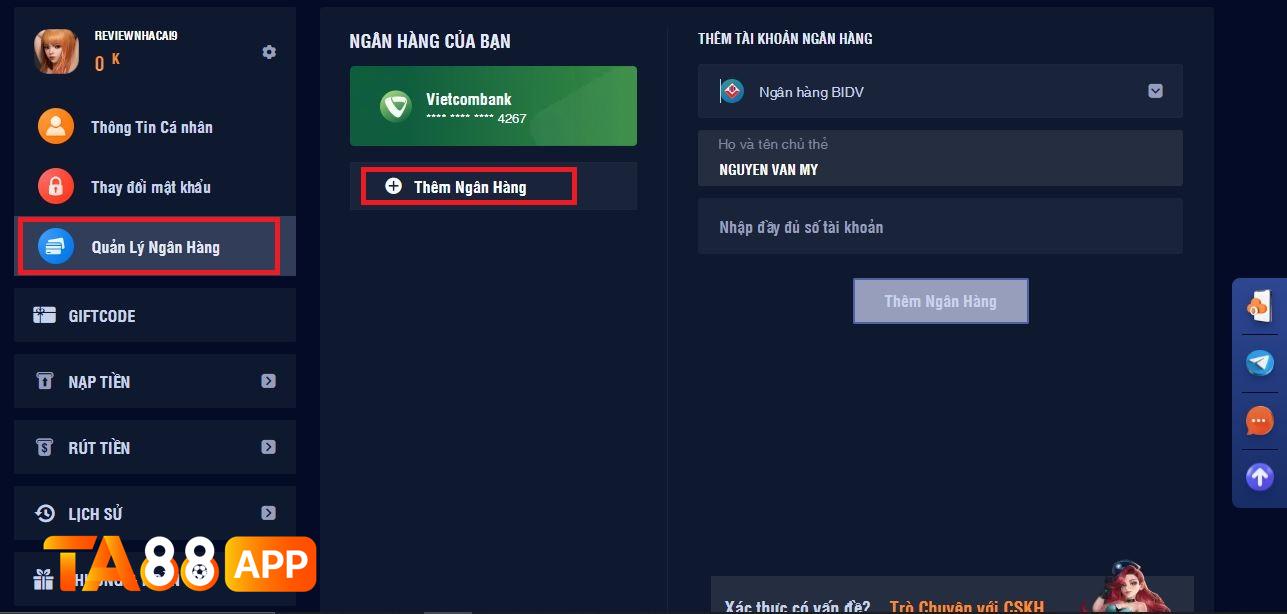 Bước 1: Truy cập mục Quản lý thông tin cá nhân tại trang chủ Ta88. Nhấn vào Quản Lý Ngân Hàng để thêm tài khoản ngân hàng BIDV vào Nhà cái Ta88. Nhấn vào nút Thêm Ngân Hàng để điền thông tin thẻ Ngân hàng bảo mật tuyệt đối giao dịch tại Ta88