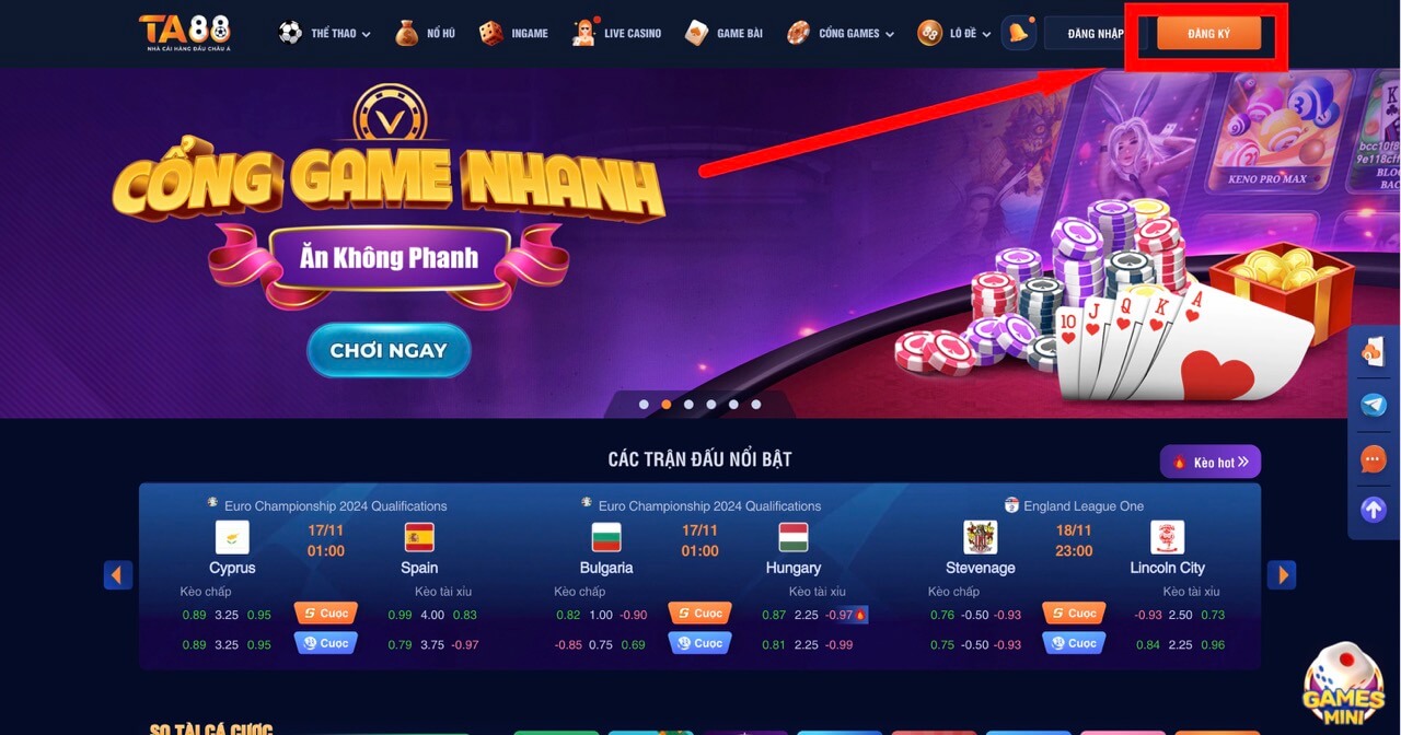 Bước 2: Sao khi vào trang chủ Ta88, bấm vào nút “Đăng Ký”