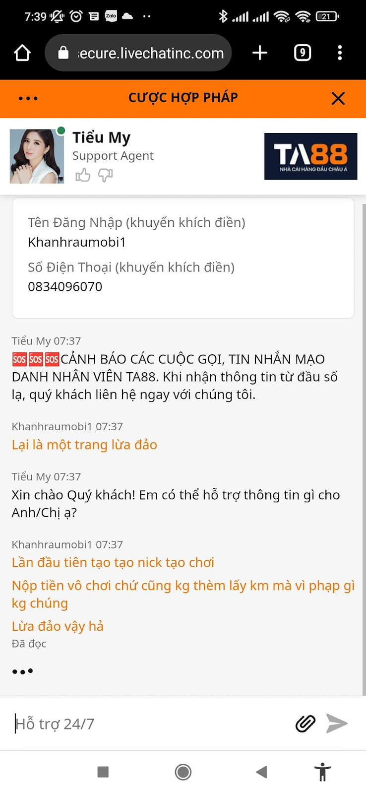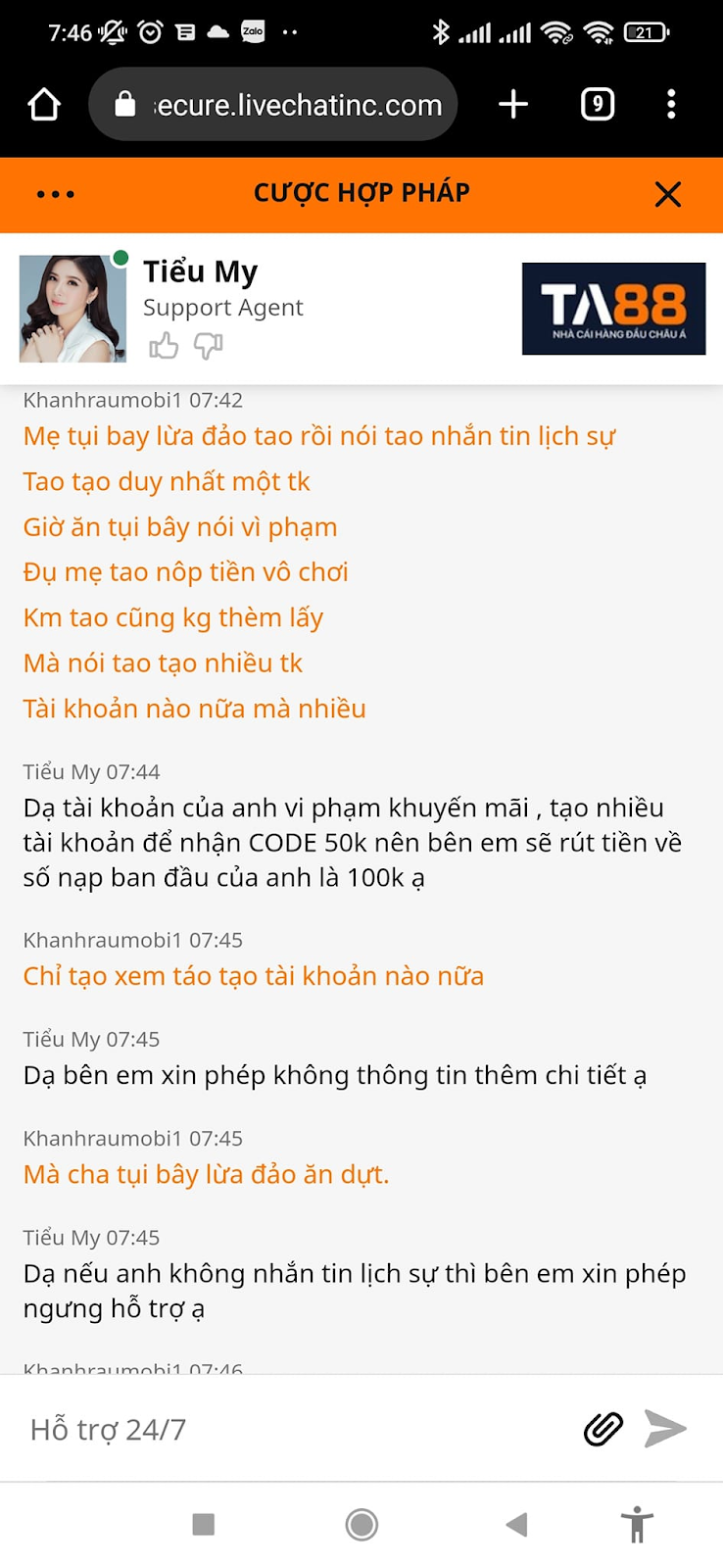 Mở đầu bối cảnh chính là đoạn chat giữa tài khoản tên Khanhraumobi1 và nhân viên của TA88. Anh cho rằng sau khi tạo tài khoản nhà cái một thời gian và đang tham gia cá cược tại đây thì bị TA88 khóa nick không rõ lý do.