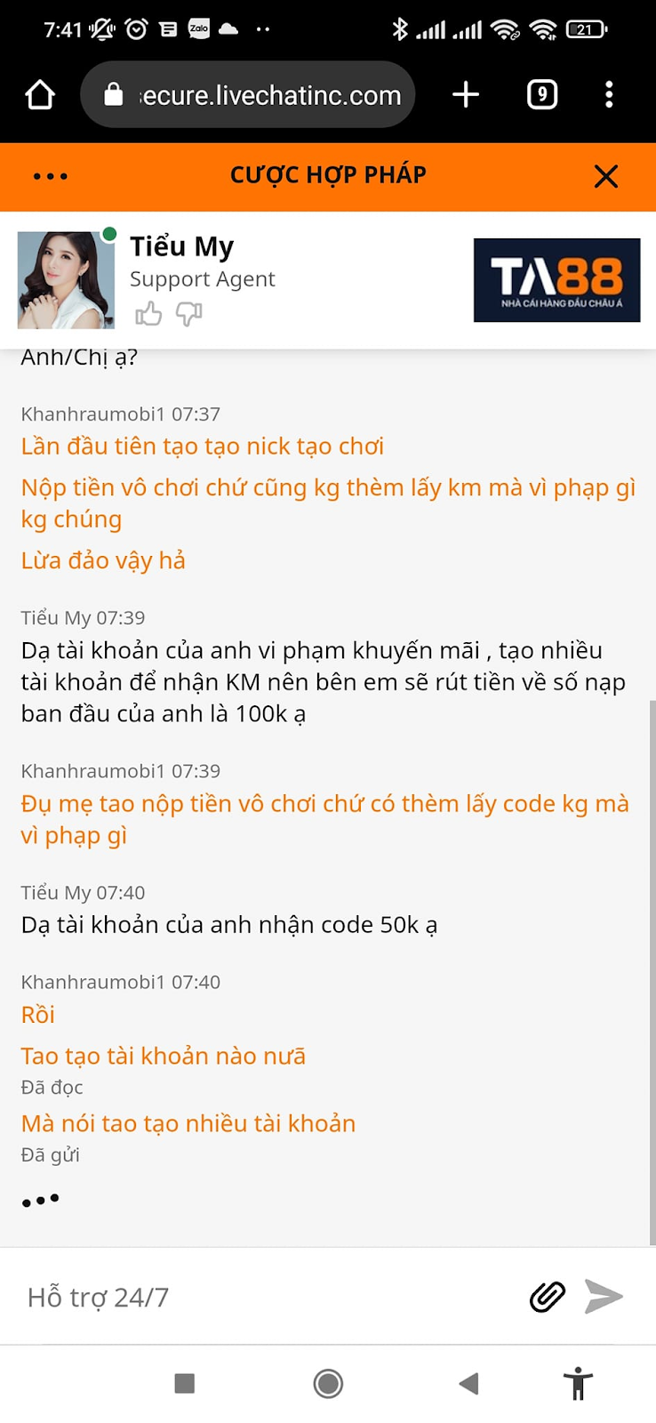 Mở đầu bối cảnh chính là đoạn chat giữa tài khoản tên Khanhraumobi1 và nhân viên của TA88. Anh cho rằng sau khi tạo tài khoản nhà cái một thời gian và đang tham gia cá cược tại đây thì bị TA88 khóa nick không rõ lý do.