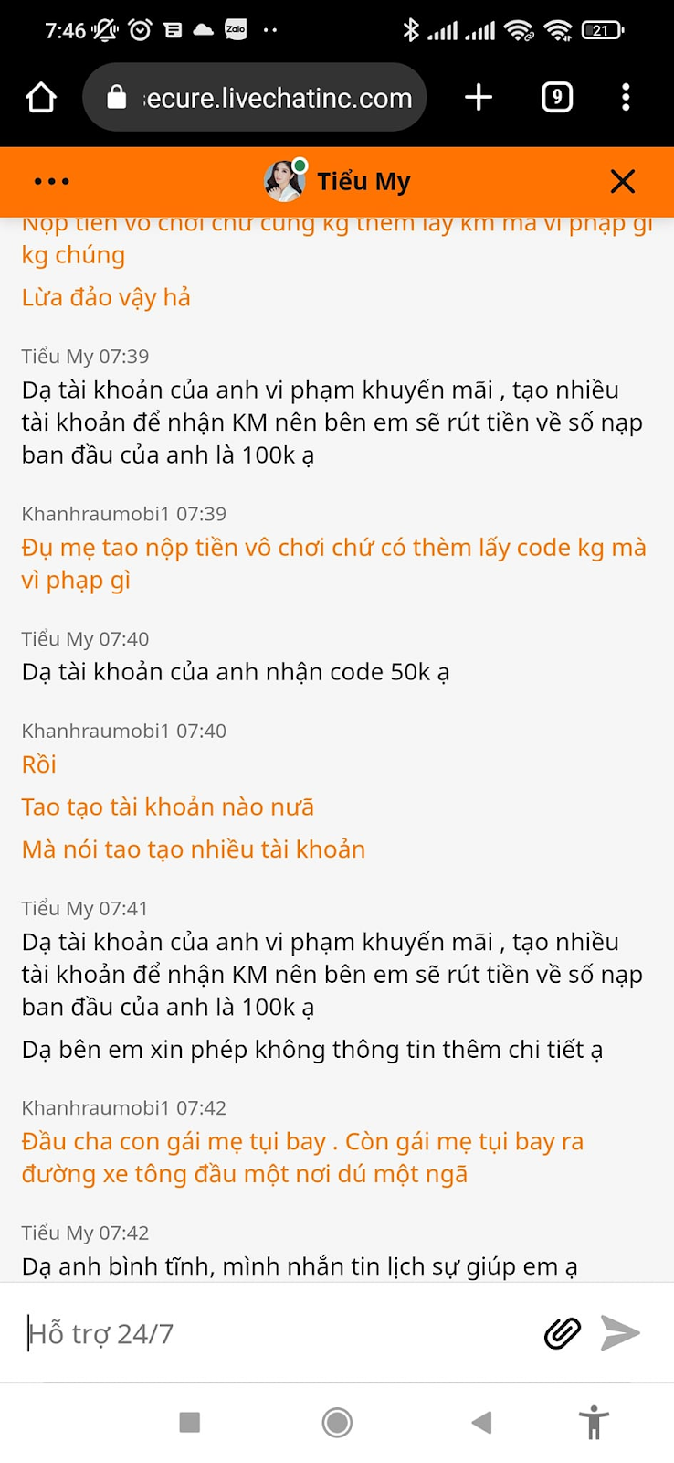 Nhân viên của TA88 lịch sự, giải quyết sự cố một cách chuyên nghiệp và chỉ rút lại tiền khuyến mãi và chỉ giữ lại gốc ban đầu mà người chơi nạp vào là 100K.