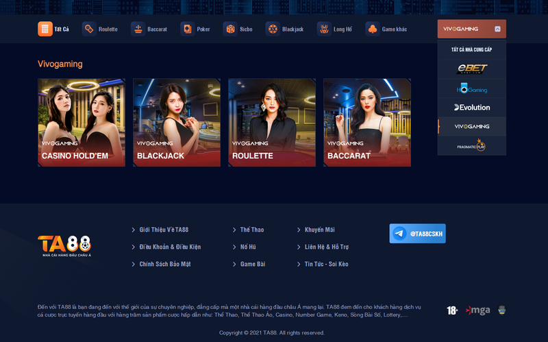 Nhà cung cấp Vivo Gaming là đơn vị chuyên cung cấp những tựa game live casino cho các nhà cái cá cược. Và Ta88 là một trong những nhà cái đang đồng hành cùng nhà cung cấp này.